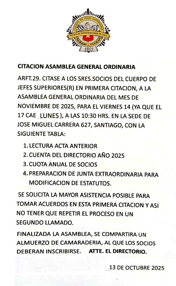 EL PRESIDENTE DE LA CORPORACION DON ROBERTO FLORES CASTILLO Y SU DIRECTORIO, CONVOCA E INVITA CORDIALMENTE A LOS DISTINGUIDOS SOCIOS, A ASISTIR Y PARTICIPAR EN LA ASAMBLEA GENERAL ORDINARIA ANUAL 2025, QUE SE REALIZARA EL DÍA VIERNES 14 DE NOVIEMBRE A LAS 10:30 HORAS, EN LAS DEPENDENCIAS DE NUESTRA CASA CORPORATIVA, Y POSTERIORMENTE, SE LLEVARÁ A CABO LA REUNION-ALMUERZO DE CAMARADERÍA DEL MES DE NOVIEMBRE.