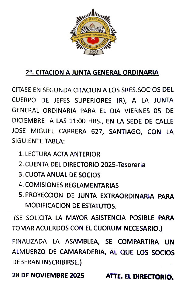 "SEGUNDA ASAMBLEA GENERAL AÑO 2025 CUERPO DE JEFES SUPERIORES, PDI"